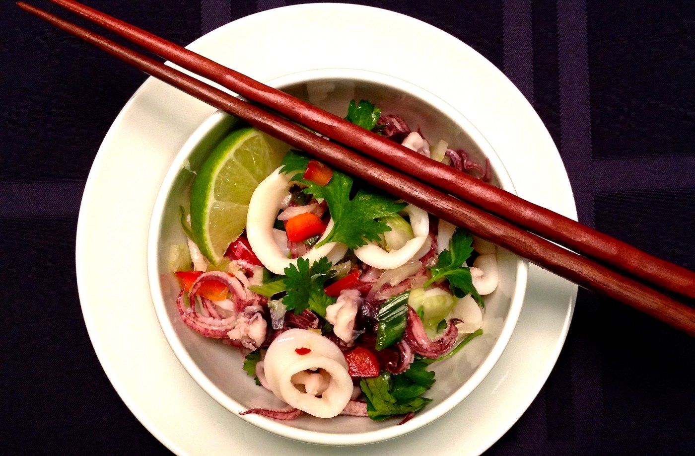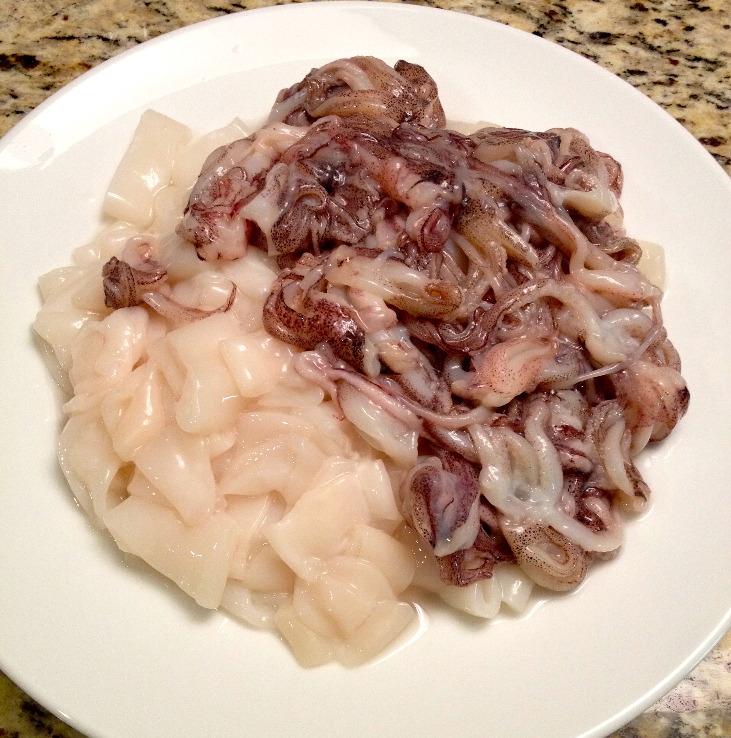One of the best things I have discovered is calamari. It comes frozen, withstands the cold temperatures far better than delicate fish, and cooks up almost immediately. As much as I love fried calamari, my mom and I have discovered a less fattening and labor intensive method of cooking this mollusk: squid salad! All it takes is a bit of vegetable chopping and a quick blanch before you’re chomping down on a healthy, delicious meal.