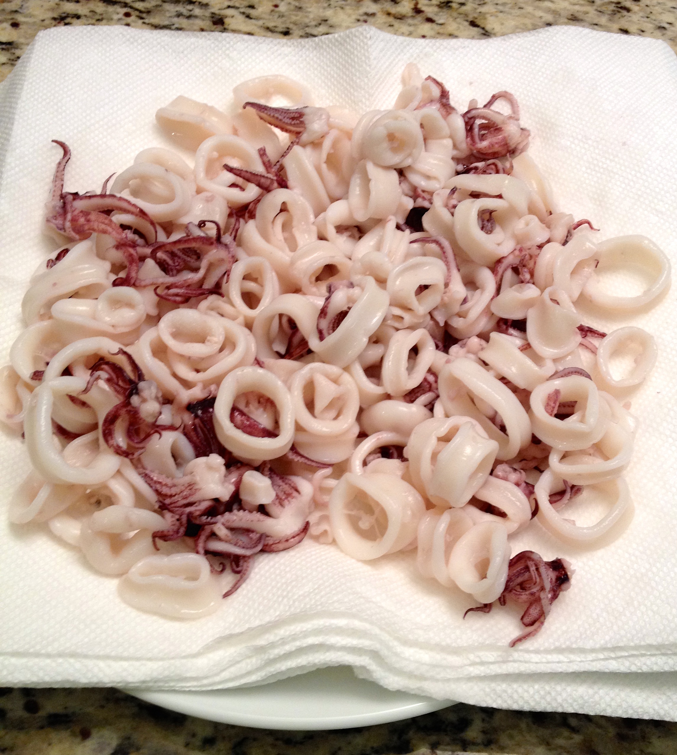 In boiling, salted water, cook calamari for 3 minutes. Remove from pot with spider or slotted spoon and immediately drop into ice water bath to stop cooking. Cool for about three minutes, then drain onto paper towels. Remove as much water as possible.